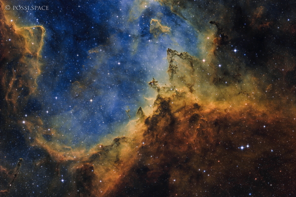 220510 IC5070 Pelican Nebula RASA36 Schmalbandaufnahme Hubble II, ASI6200MM PRO, 8,2h belichtet, davon 5,7h (70%) verrechnet. Seeing gut bis mittel, 3 Nächte fast Vollmond 16.05.2022, 19:37:13