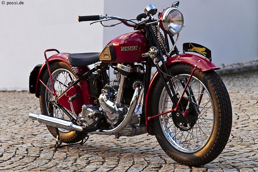 Liebevolle, voll fahrtaugliche Restauration eines extrem seltenen britischen Einzylinder-Motorrades mit 500cc und 26 PS. Eines von sieben dokumentierten, die von den 348 beim Hersteller Phelon & Moore in Yorkshire gebauten Fahrzeugen erhalten blieben. Die anderen je zwei Exemplare stehen in Südafrika und Grossbritannien (zwei davon sollen noch halbwegs funktionieren), in Belgien und in Deutschland. Und mein Exemplar fährt sogar einwandfrei. Irgendwie ein Kette von Zufällen, wie ich daran gekommen bin, da ich (zumindest damals noch) eigentlich keine Vorkriegsmodelle sammlte. Aber das ist was ganz Besonderes und sieht auch absolut klasse aus N trotz der roten Farbe. Sie ist ein Fantasiewerk des Restaurateurs, der keine Fotos des Motorrades im Originalzustand finden konnte. Im Original war der Tank wohl in bicolor. Restauration: W. Beham, Deggendorf.